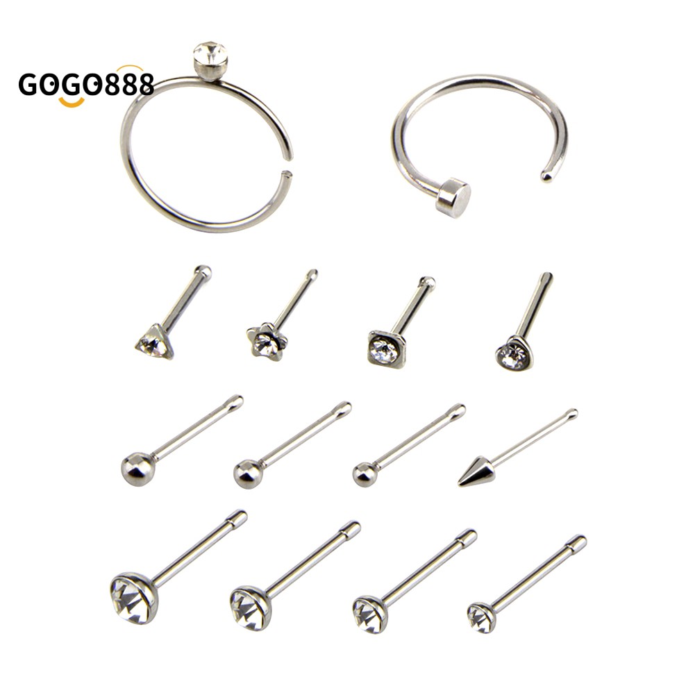 Gogo888 14pcs Set C O Shape Rhinestone Stainless Steel Nose Stud